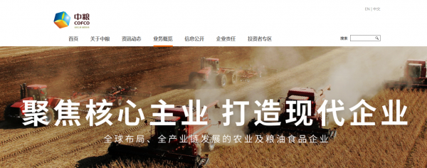 中*集團(tuán)有限公司(COFCO)是立足中國(guó)的國(guó)際一流糧食企業(yè),是全球布局、全產(chǎn)業(yè)鏈、擁有最大市場(chǎng)和發(fā)展?jié)摿Φ霓r(nóng)業(yè)及糧油食品企業(yè),集貿(mào)易、加工、銷(xiāo)售、研發(fā)于一體的投資控股公司。中糧集團(tuán)以“確保國(guó)家糧食安全,把中國(guó)人的飯碗牢牢端在自己手中”為己任,致力于打造具有全球競(jìng)爭(zhēng)力的世界一流糧食企業(yè),構(gòu)建具有中糧特色的國(guó)有資本投資公司。