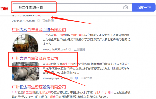 廣州*源再生資源有限公司選用我司企業再生資源的網站優化產品,其SEO關鍵詞有再生資源。一對一定制服務,產品經理在線支持,無憂售后,適用于各個企業,提供一站式網絡營銷服務。百度搜索引擎優化,提升品牌關鍵詞的正面內容信息展現,體現良好的口碑宣傳。廣州*源再生資源有限公司成立于2019年,是經廣州市市場監督管理局審核的有資質的公司,其統一社會信用代碼:91440101M**CL3KT47。公司地址:廣東省廣州市黃埔區新龍鎮鎮龍村上境大道五巷十一號。