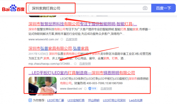 深圳市*恩照明有限公司百度排名最快上詞效果展示