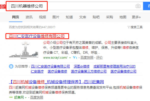 我們公司與四川仁安醫療設備維修有限公司合作中,對這個公司所經營的機器維修這個行業提供了搜索引擎優化推廣,與改公司的合作,更多的客戶讓我們公司為其提供搜索引擎優化推廣,通過每一次合作,我們公司不斷完善自己,同時希望合作伙伴在經營的路上越來越好。