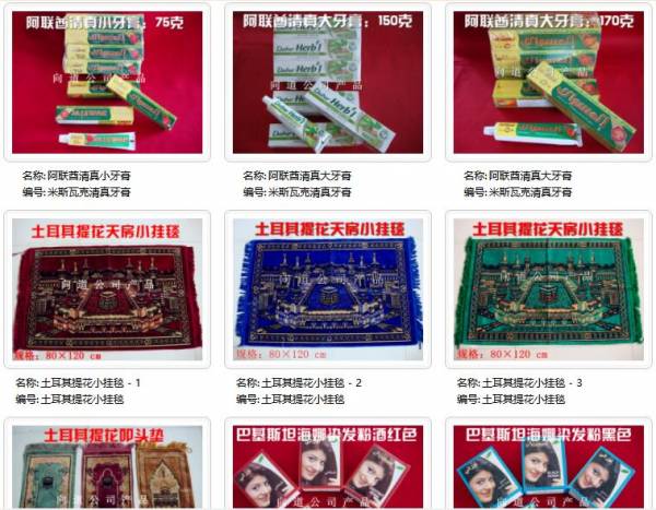 本公司生產經營有:巴基斯坦禮拜毯. 土耳其禮拜毯. 比利時絲毯系列. 沙特天方掛毯系列. 向道品牌禮拜帽系列. 孟加拉手工帽. 馬來西亞船型帽 .巴基斯坦纏頭巾 .各類太斯碧海(念珠)系列 .國內外清真日化系列 .布哈拉品牌系列禮拜服. 禮拜褲. 沙特香水. 印度各類衛生香. 麥地那椰棗 .麥加澤目澤目水 .巴基斯坦手工銅器工藝品系列等,歡迎廣大穆斯林客戶朋友前來洽談業務。