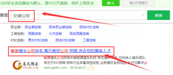 我們公司與 上海高凡人才信息咨詢有限公司合作中,對這個公司所經營的服裝這個行業的百度快照排名積累了豐富的經驗;同時在該行業的百度快照排名O優化推廣,百度快照排名,搜索引擎優化推廣,快速排名,關鍵詞搜索排名,SEO網站優化,網站建設制作設計,而且有專業的配備專業SEO優化團隊,幫助企業定位,鎖定目標用戶,在360、百度等知名搜索引擎享搶占互聯市場。我司誠摯為你服務,歡迎你的到來。