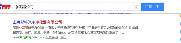 郎特企業選用我司企業的網站設計優化產品,其seo關鍵詞為凈化器. 通過SEO做好排名后,一般可以保持半年以上的良好效果,大大節約成本,有效提升企業品牌知名度。按日收費,不限次數點擊,為企業呈現每一步優化效果,有據可循,并承諾關鍵字上了百度首頁才扣費。郎特企業公司成立于2003年,是經上海市市場監督管理局審核的有資質的公司,公司地址:上海市松江區車墩鎮三浜路60號