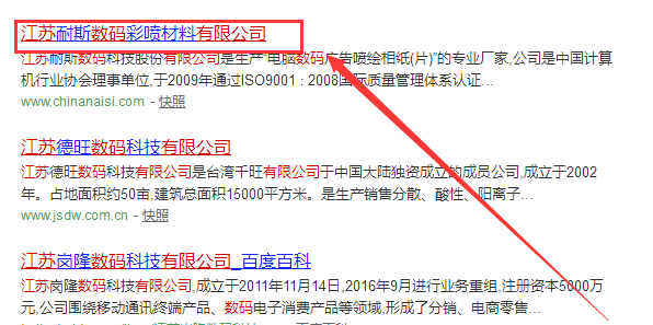 江蘇耐斯數碼科技股份有限公司選用我司數碼行業的網站設計優化產品,其SEO關鍵詞有數碼彩噴,耐斯數碼科技股份有限公司成立于2009 年,是經泰州市市場監督管理局審核的有資質的公司,其統一社會信用代碼:321282000015878。公司地址:江蘇省靖江市興業路12號