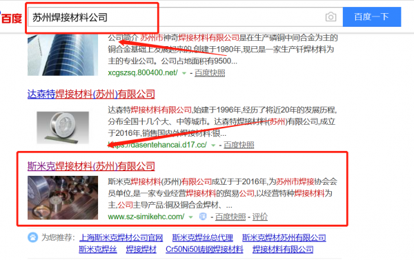 斯米克焊接材料(蘇州)有限公司選用我司企業焊接材料的網站優化產品,其SEO關鍵詞有焊接材料。采用全球領先的關鍵詞三維云計算系統,智能關鍵詞報價查詢,徹底杜絕高價、朦朧價。自助提交優化任務,自由設定指定關鍵詞,指定排名位置,避免傳統銷售誘導。斯米克焊接材料(蘇州)有限公司成立于2016年,是經蘇州市市場監督管理局審核的有資質的公司,其統一社會信用代碼:91320594MA1MPLAA8W。公司地址:江蘇省蘇州工業園區中銀惠龍大廈1幢1808室。