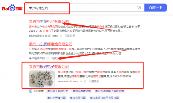 泰興市振*電子有限公司選用我司企業電池的網站優化產品,其SEO關鍵詞有電池。搜索品牌詞,首頁至少霸占5條,通過營銷型網站、媒體文章、口碑等方式,達到全方位霸屏,全面展示企業實力。泰興市振*電子有限公司成立于1987年,是經泰興市市場監督管理局審核的有資質的公司,其統一社會信用代碼:913212837**41093XD。公司地址:江蘇省泰興市黨校路33-8號。