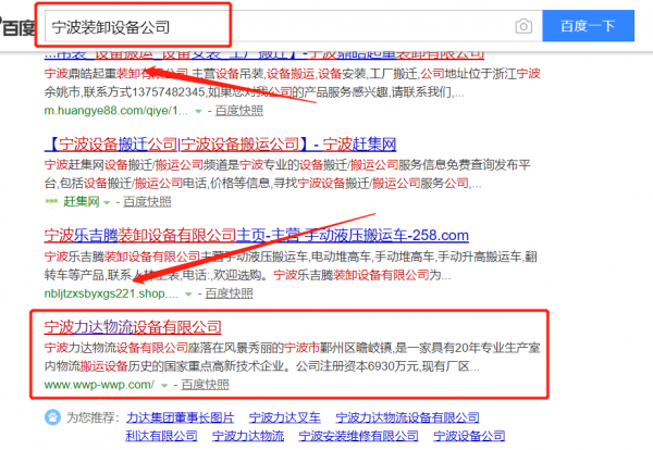 寧波力達物流設備有限公司選用我司企業裝卸設備的網站優化產品,其SEO關鍵詞有裝卸設備。無論你關鍵詞是在20名內、30名內、還是50名內。我們都可以在最短時間優化至搜索引擎的首頁。提供后臺管理,排名查詢、關鍵詞管理、財務扣費一目了然,一鍵操作。寧波力達物流設備有限公司成立于2007年,是經寧波市市場監督管理局審核的有資質的公司,其統一社會信用代碼:91330212665576290D。公司地址:浙江省寧波市鄞州區瞻岐鎮西城村。