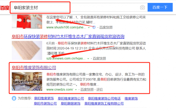我們公司與阜陽市維度裝飾有限公司合作中,對這個公司所經營的家裝主材這個行業提供了關鍵詞搜索排名,與該公司的合作,更多的客戶讓我們公司為其提供關鍵詞搜索排名,通過每一次合作,我們公司不斷完善自己,同時希望合作伙伴在經營的路上越來越好。