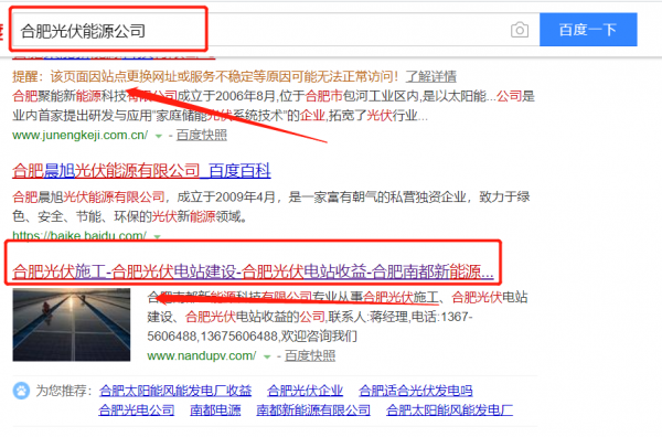 我們公司與合肥南都新能源科技有限公司合作中,對這個公司所經營的光伏能源這個行業提供了百度快照排名,與該公司的合作,更多的客戶讓我們公司為其提供百度快照排名,通過每一次合作,我們公司不斷完善自己,同時希望合作伙伴在經營的路上越來越好。