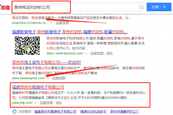 我們公司與福建泉州市精通電子有限公司合作中,對這個公司所經營的電話對講機這個行業提供了關鍵詞搜索排名,與該公司的合作,更多的客戶讓我們公司為其提供關鍵詞搜索排名,通過每一次合作,我們公司不斷完善自己,同時希望合作伙伴在經營的路上越來越好。