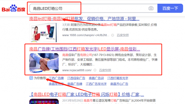 我們公司與南昌佳*廣告有限公司合作中,對這個公司所經(jīng)營的LED燈箱這個行業(yè)提供了百度關(guān)鍵詞排名,與該公司的合作,更多的客戶讓我們公司為其提供SEO推廣,通過每一次合作,我們公司不斷完善自己,同時希望合作伙伴在經(jīng)營的路上越來越好。