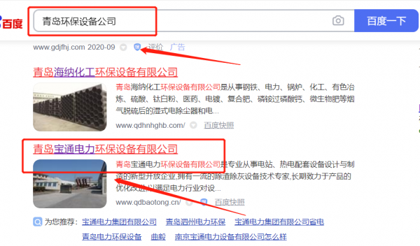 青島*通電力環保設備有限公司百度排名最快上詞效果展示