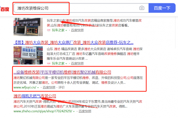 我們公司與濰坊*億機械有限公司合作中,對這個公司所經營的改裝維保這個行業提供了搜索引擎優化推廣,與該公司的合作,更多的客戶讓我們公司為其提供搜索引擎優化推廣,通過每一次合作,我們公司不斷完善自己,同時希望合作伙伴在經營的路上越來越好。