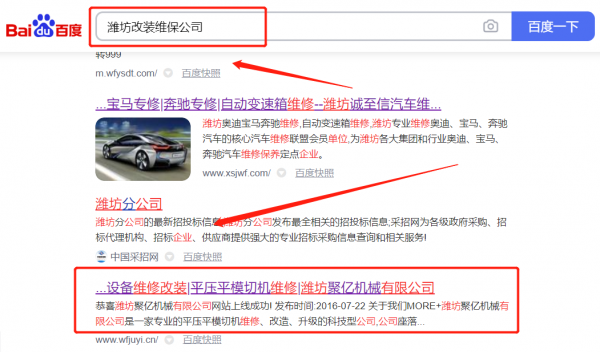 我們公司與濰坊聚*機械有限公司合作中,對這個公司所經營的改裝維保這個行業提供了網站SEO優化,與該公司的合作,更多的客戶讓我們公司為其提供百度快照排名,通過每一次合作,我們公司不斷完善自己,同時希望合作伙伴在經營的路上越來越好。