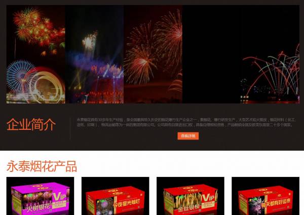 瀏陽市*泰出口煙花制造有限公司選用我司企業(yè)化工原料行業(yè)的網(wǎng)站優(yōu)化產(chǎn)品,其SEO關(guān)鍵詞有 永泰煙花,永泰花炮,瀏陽花炮,出口花炮,盆花,禮花。其特點是用很合適的展示方式、展示效果、站點框架,把客戶及其用戶很關(guān)心的問題突出表現(xiàn);并以簡潔明朗的設(shè)計風格,清晰展現(xiàn)公司水平實力,確保一秒抓住目標用戶眼球,給用戶留下良好的第一印象。瀏陽市*泰出口煙花制造有限公司成立于2005年,是經(jīng)瀏陽市市場監(jiān)督管理局審核的有資質(zhì)的公司,其統(tǒng)一社會信用代碼:91430181732***0547。公司地址:瀏陽市太平橋鎮(zhèn)合盛村。